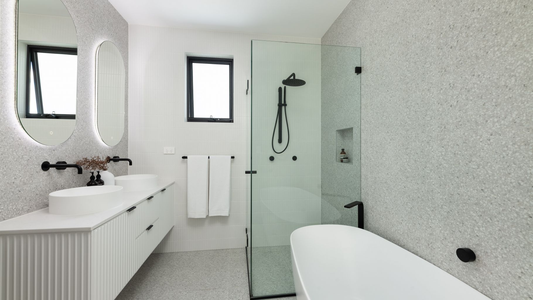 - Sleek and fully tiled family bathroom with double floating vanity, deep freestanding bath and frameless glass shower.