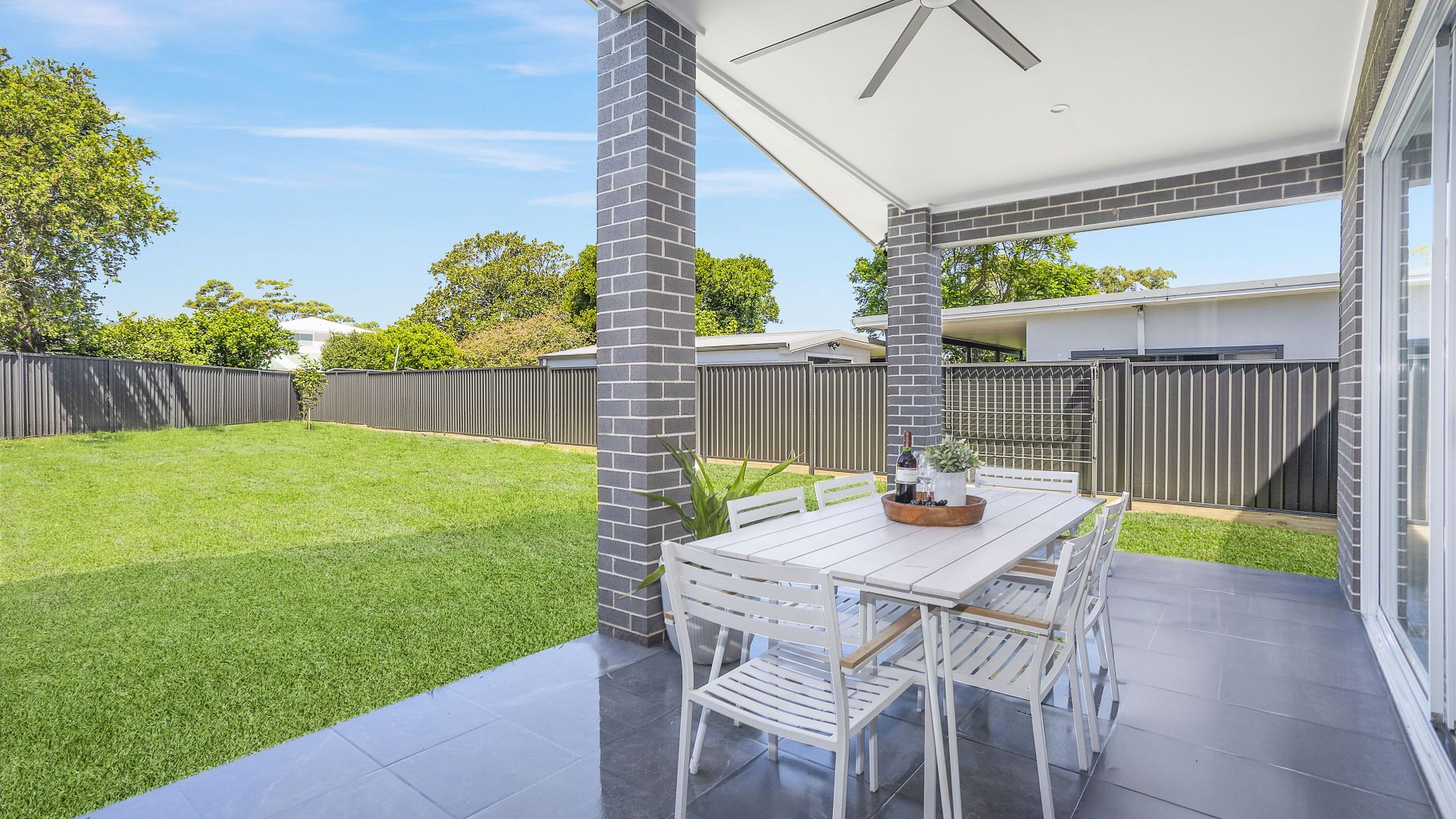 - Superb expansive paved entertaining area with a raked ceiling and ceiling fan for year round comfort, overlooking a rare level lawn, an ideal setting for a future pool.