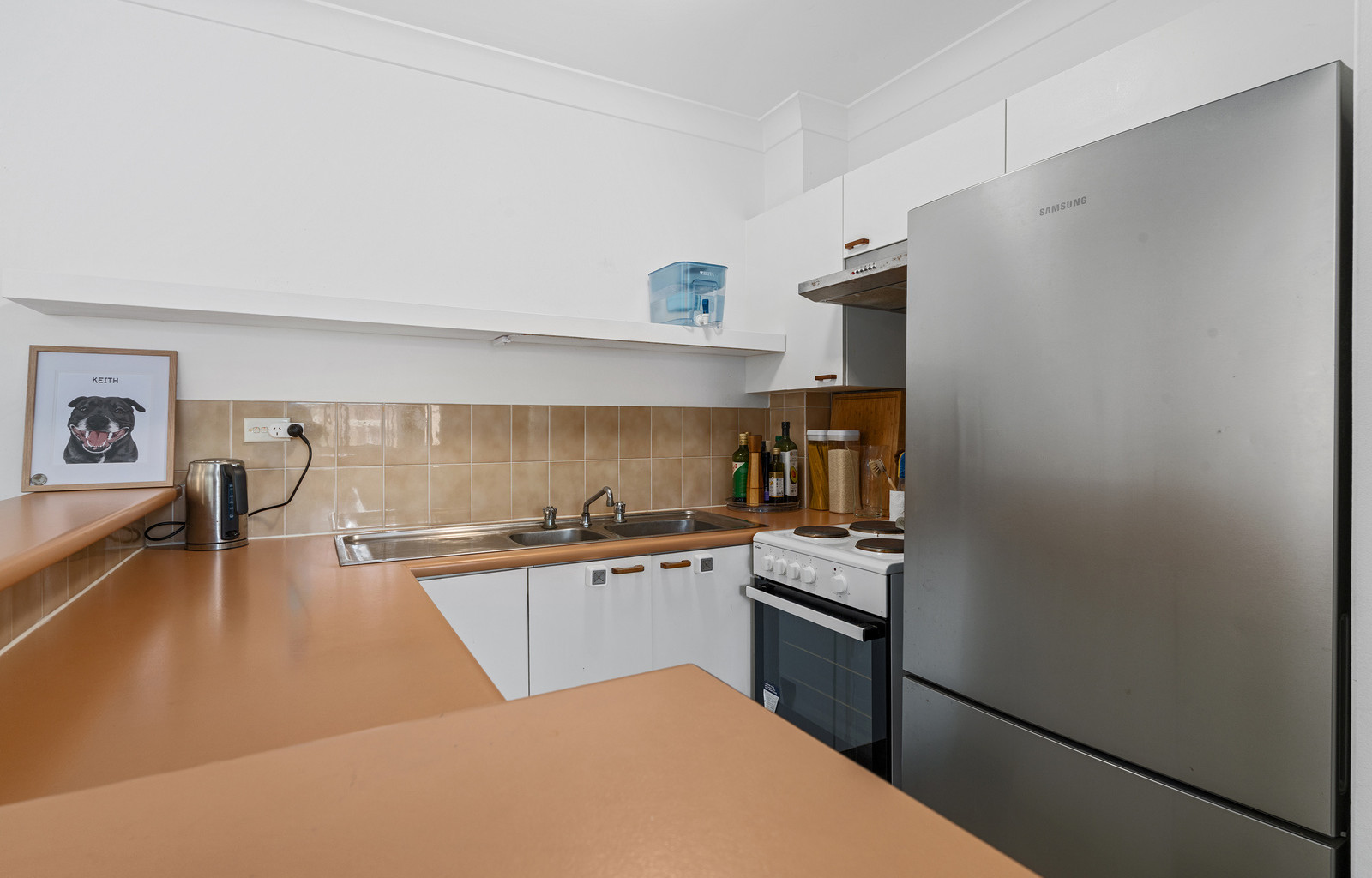 - Neat, tidy kitchen featuring a handy servery and abundant cupboard space