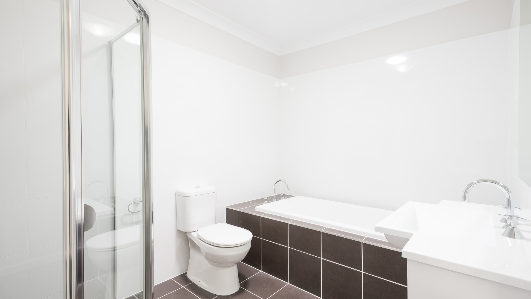 - Main bathroom with separate bath and shower, plus a mirrored vanity