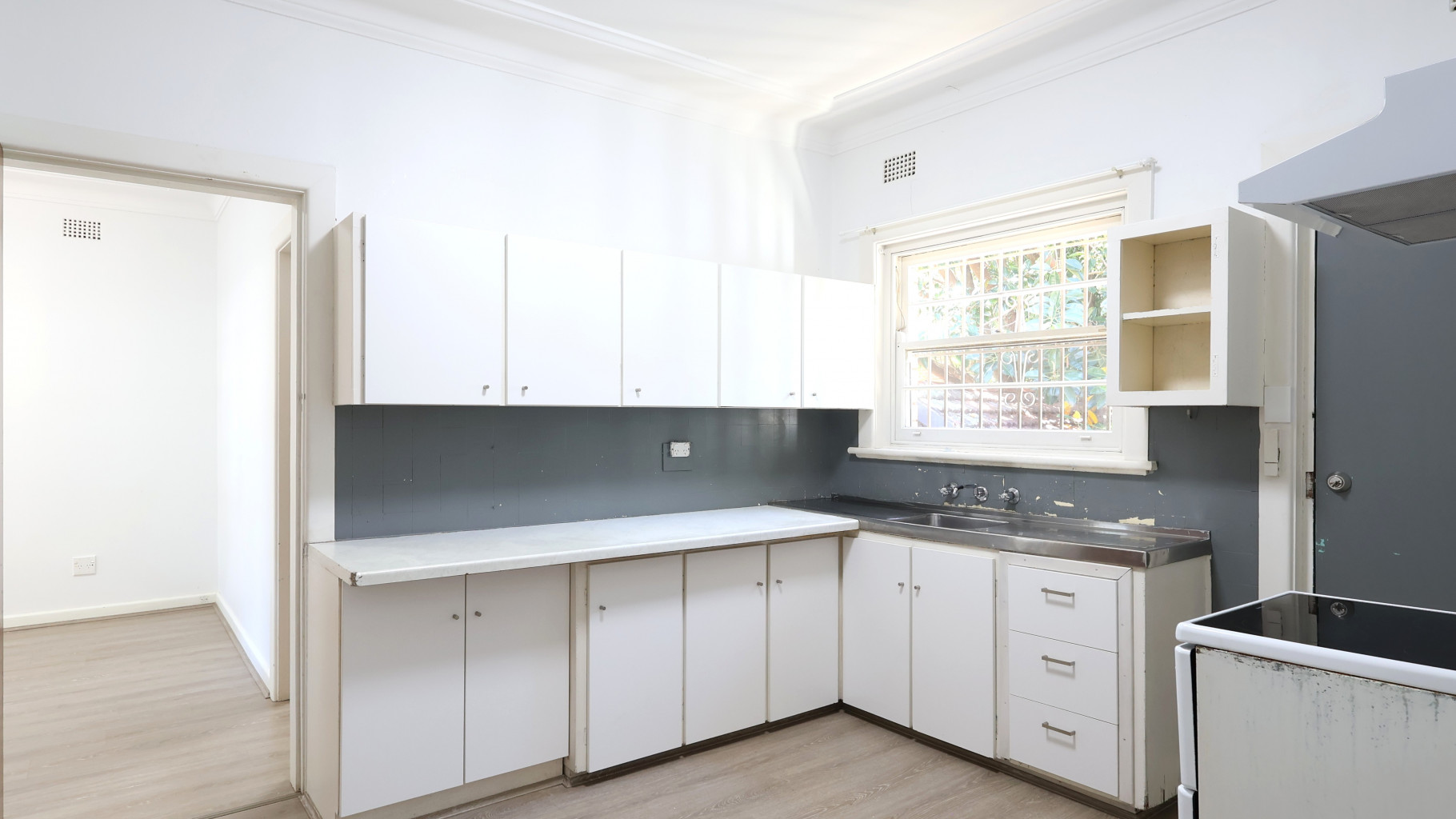 - Bright kitchen with electric oven, cooktop and ample storage