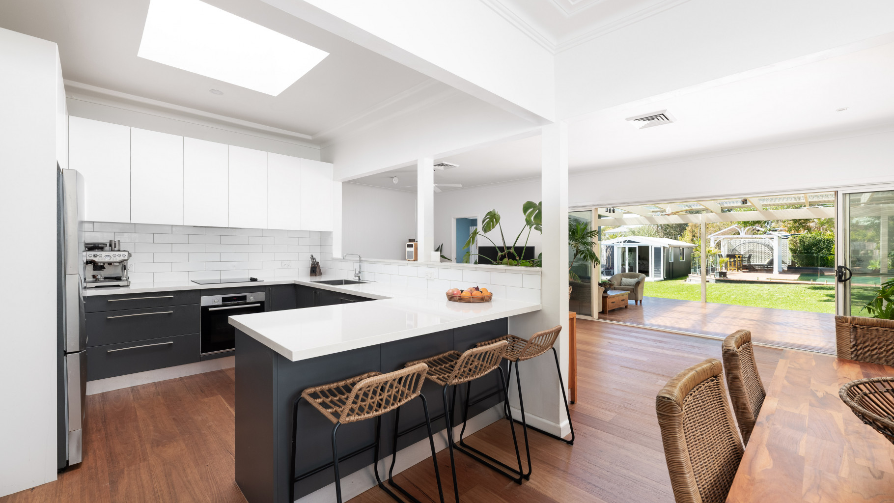 - Light filled, centrally located kitchen bathed in natural light from a stunning skylight, featuring double width Caesarstone benchtops, premium electric appliances, fully integrated dishwasher, and breakfast bar seating