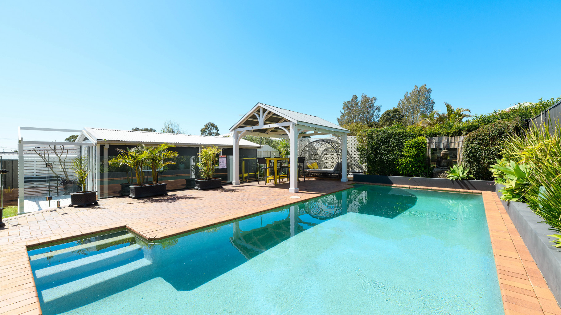 - Set amid mature landscaped gardens, the sparkling inground pool is complemented by a cabana, sundrenched deck, and a versatile fully detached, air-conditioned pool house