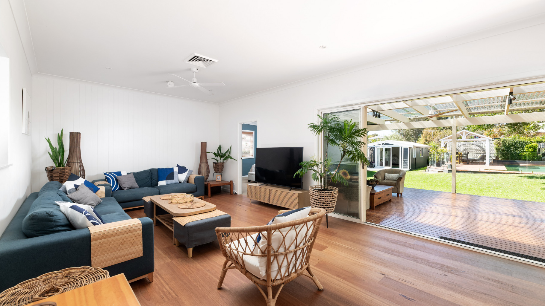 - Spacious living area featuring split system air conditioning, and ceiling fan, with seamless flow through sliding doors to a covered entertaining deck overlooking an expansive level lawn and resort style inground pool