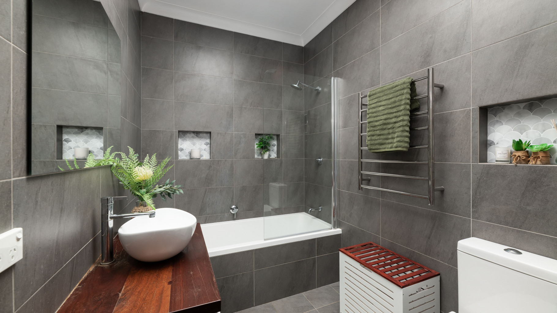 - Modern family bathroom with abundant natural light, features stylish floor to ceiling tiles and combined bath and shower