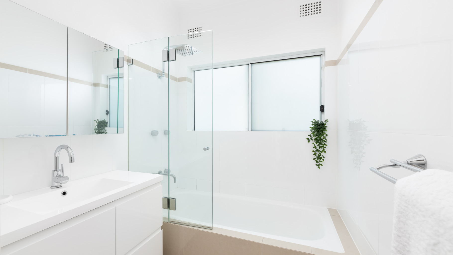 - Stylish fully tiled bathroom with a bath over shower