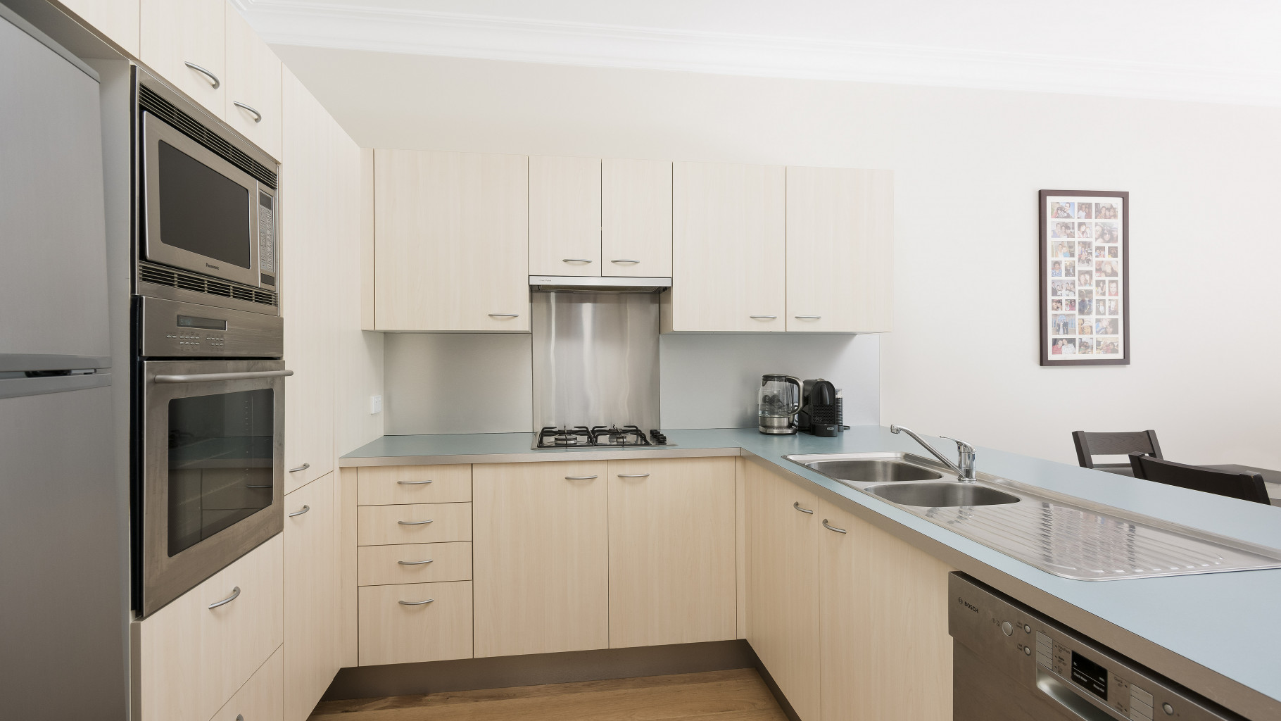 • Open plan kitchen with gas cook top, dishwasher and microwave