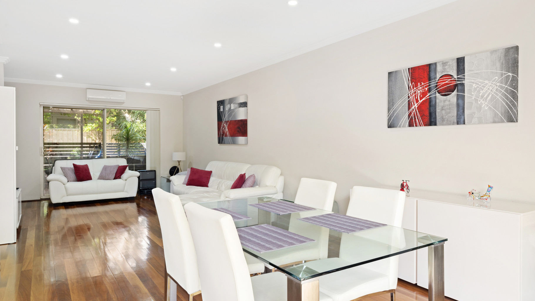- Light-filled open plan living and dining area with floorboards and split system air conditioning
