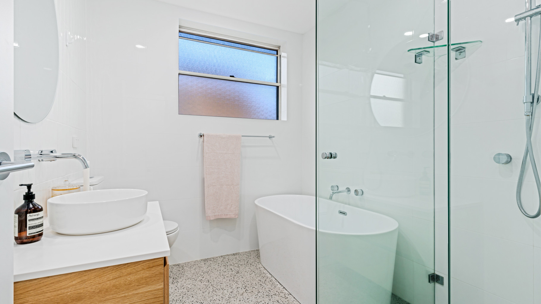 - Stunning bathroom features floor to ceiling tiles, freestanding bath and shower