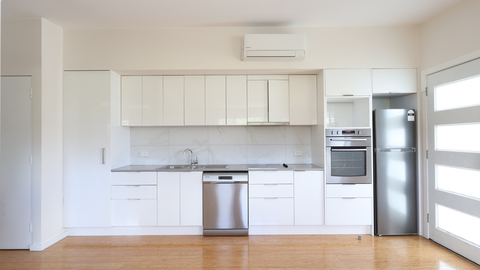 - Well-appointed kitchen with ample cupboard space, stainless-steel appliances including dishwasher, stovetop and fridge