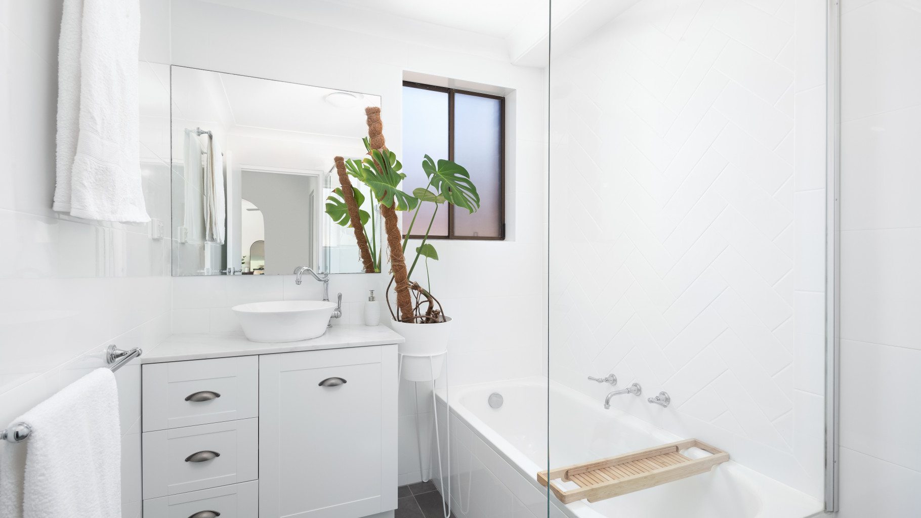 • Main bathroom with floor to ceiling tiles and separate bath to shower