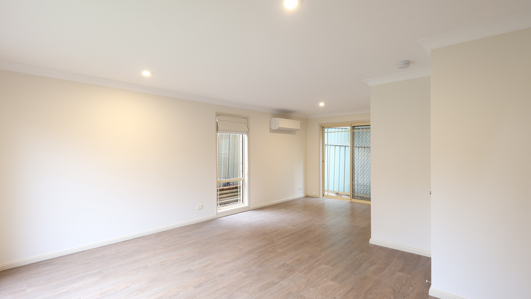- Open-plan living and dining area flowing to a grassed, fenced courtyard with garden shed