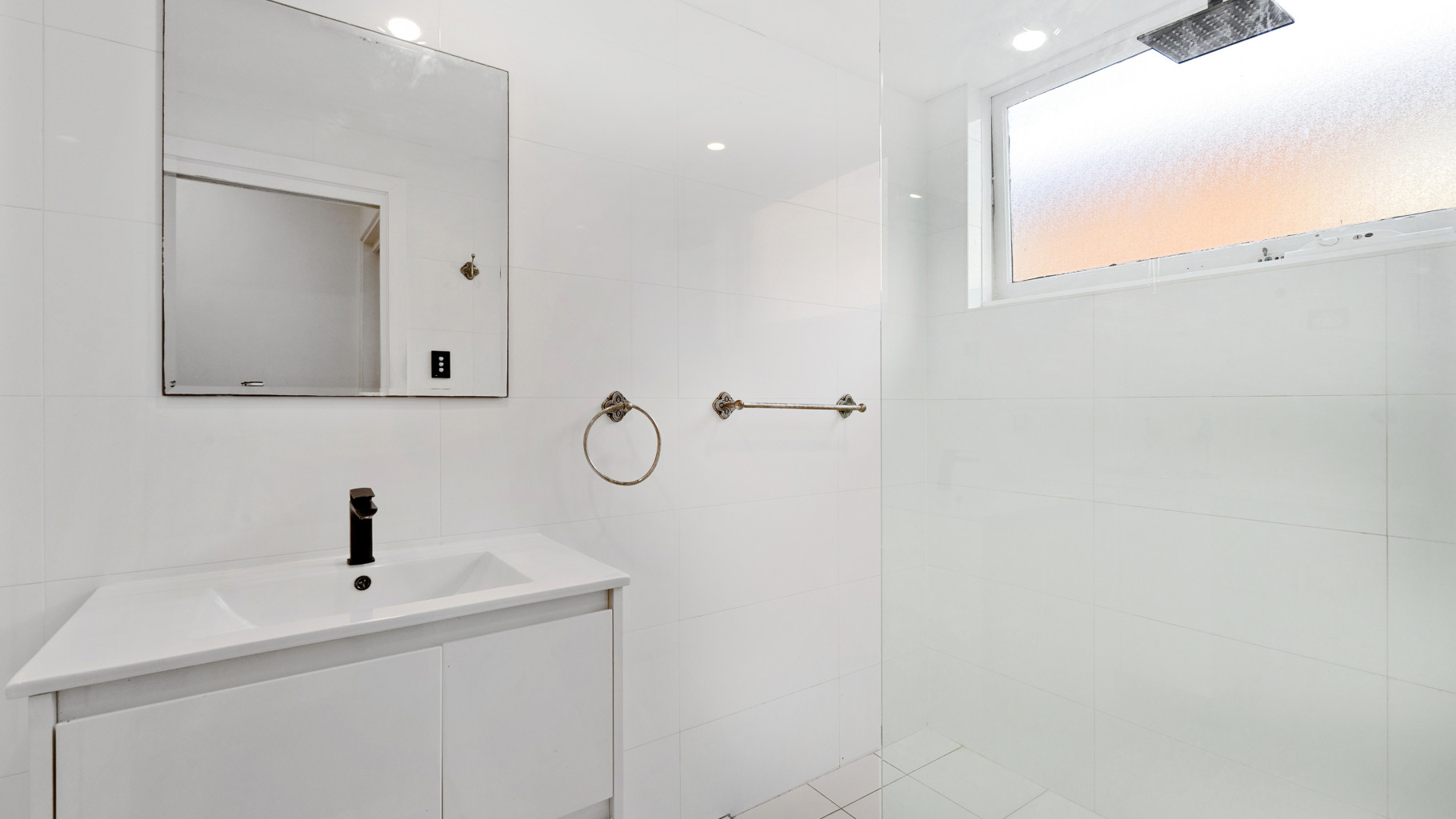 • Large bathroom with a walk-in shower, separate toilet, and laundry facilities