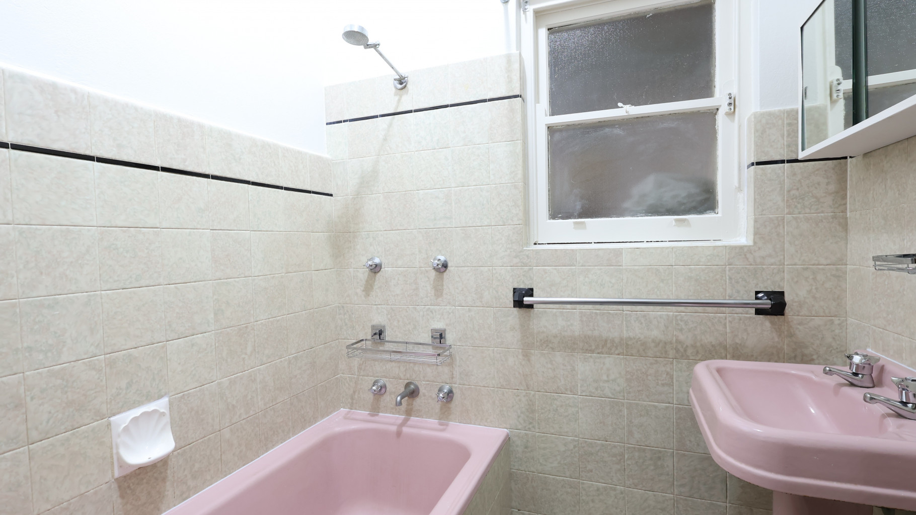 - Tiled original bathroom with bath over shower