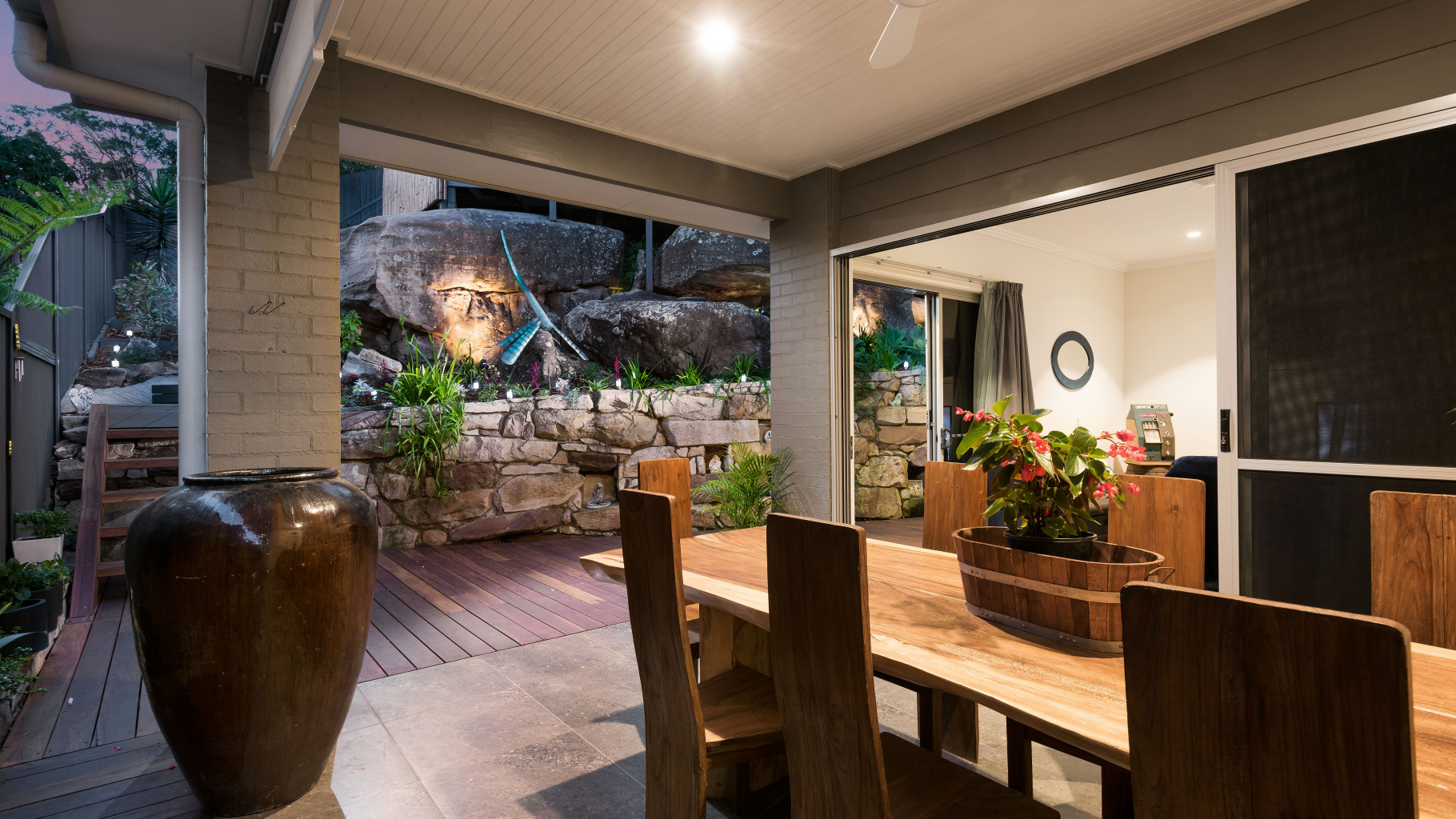 - Outdoor undercover area, perfect for alfresco dining and entertaining with downlights, ceiling fan and blinds