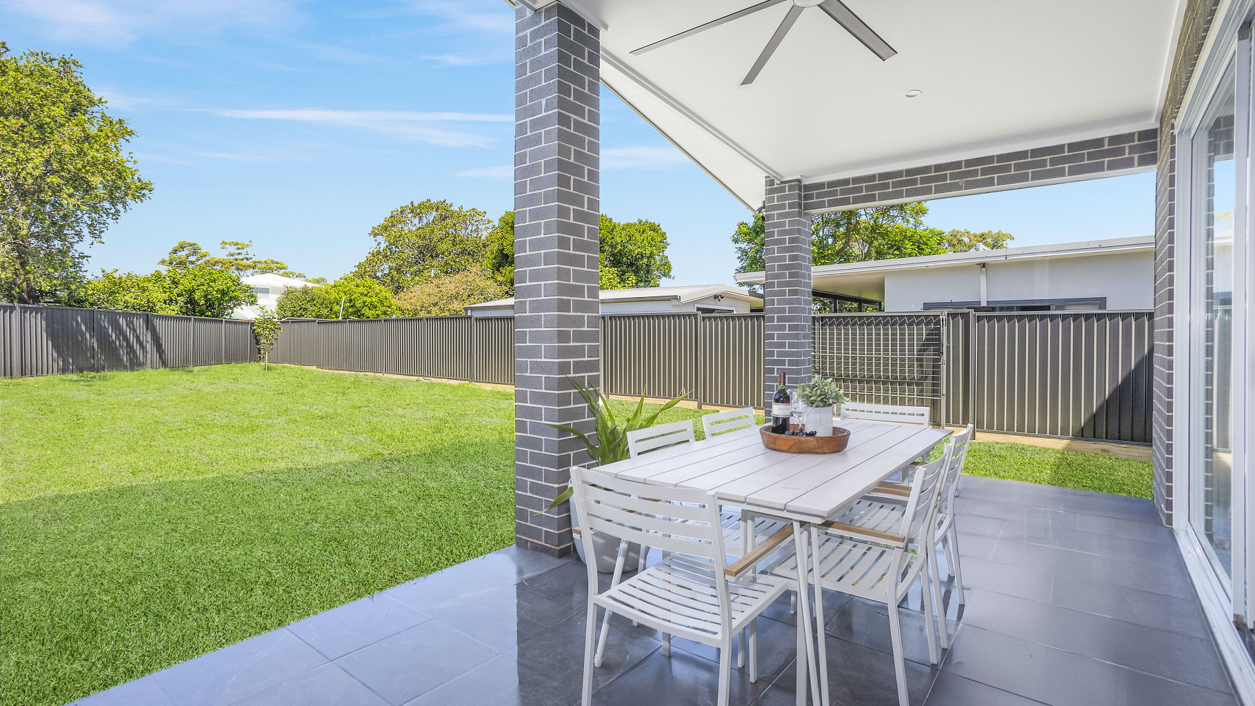 • Covered alfresco area with raked ceiling and ceiling fan, overlooking a level grassed yard
