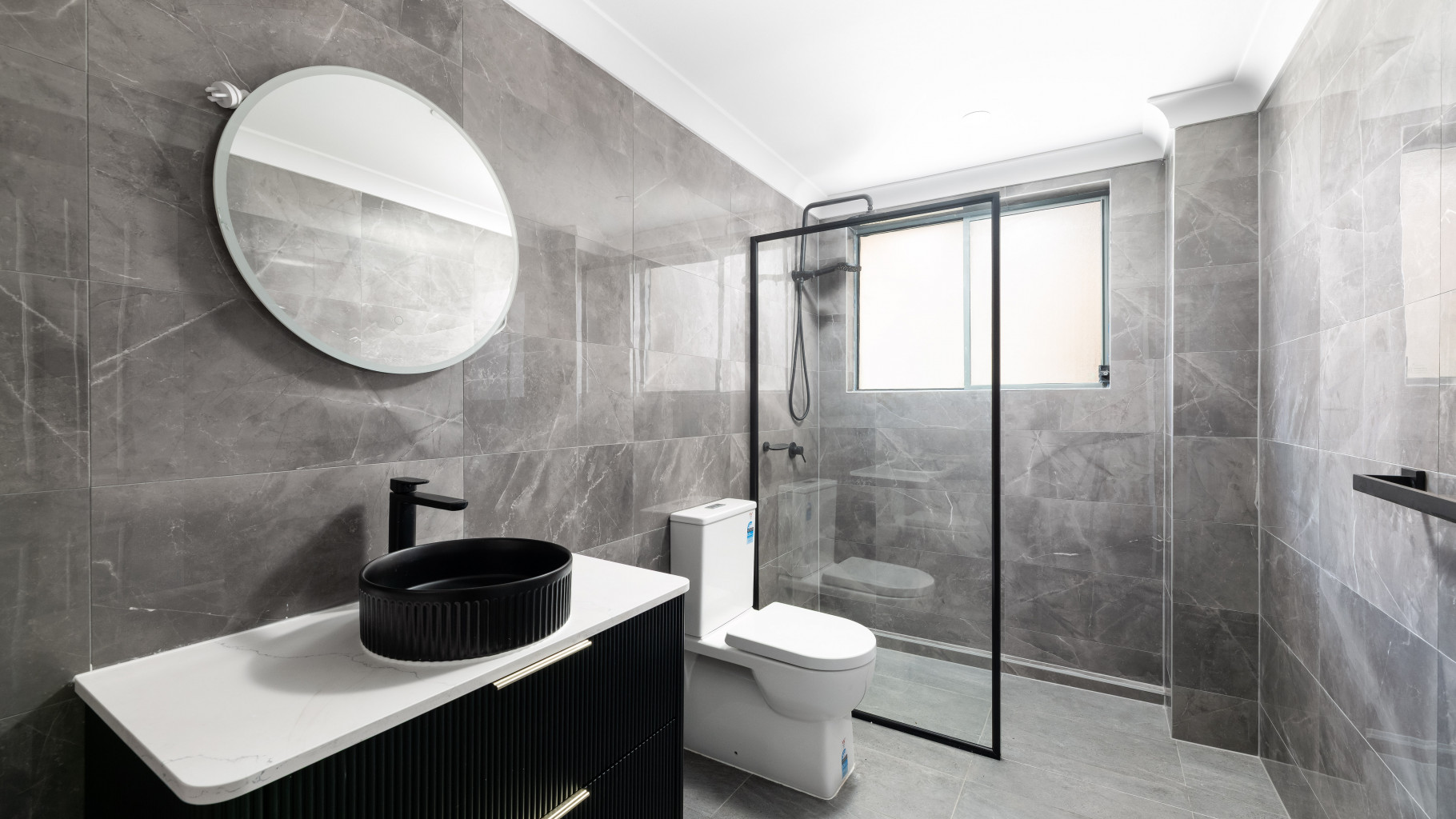 - Contemporary bathroom showcasing floor-to-ceiling tiles and a luxurious walk-in shower equipped with dual showerheads