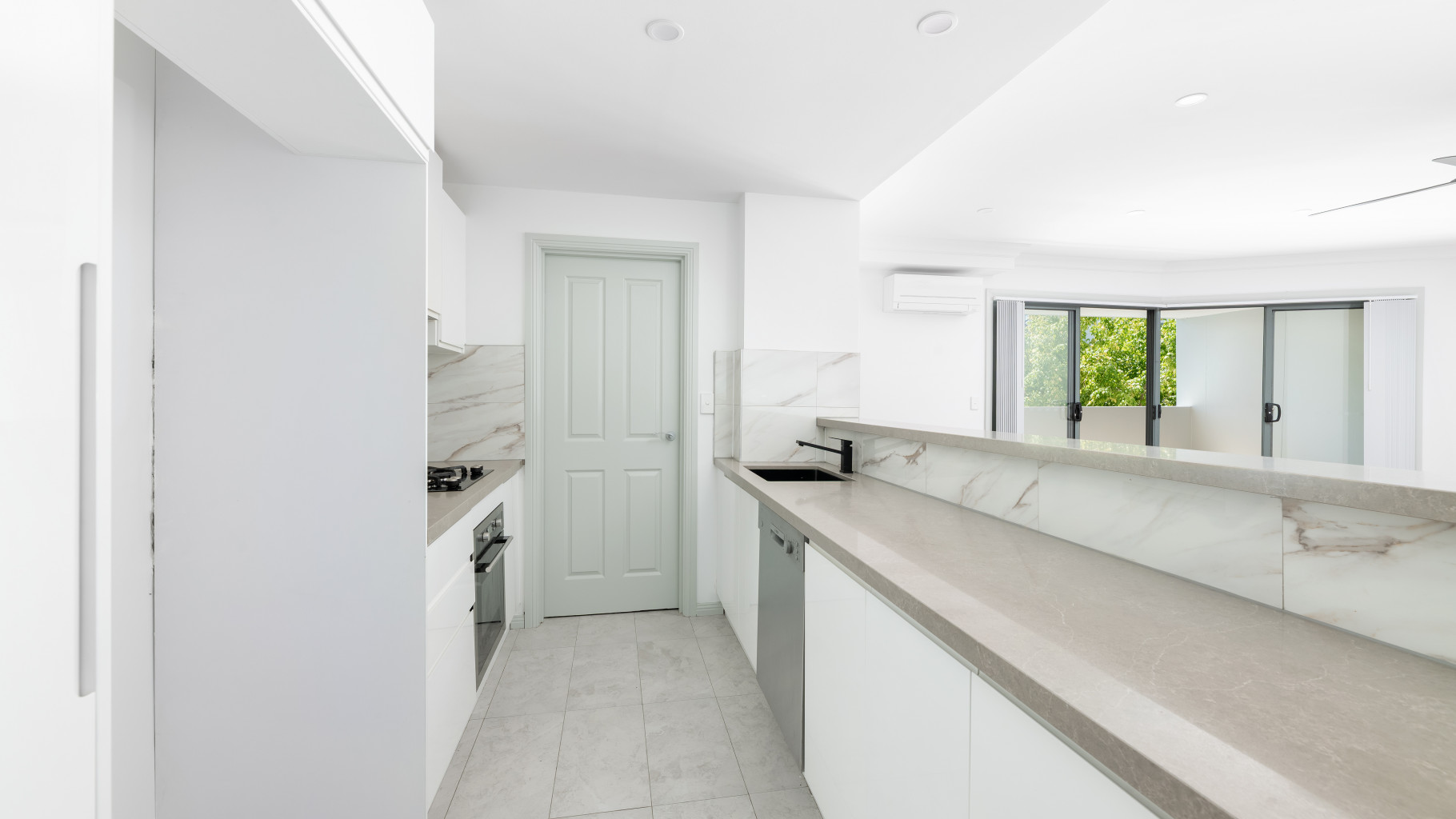 - Sleek kitchen with ample cupboard and bench space, features stunning double width stone benchtops, undermount sink, quality appliances including gas cooktop and dishwasher