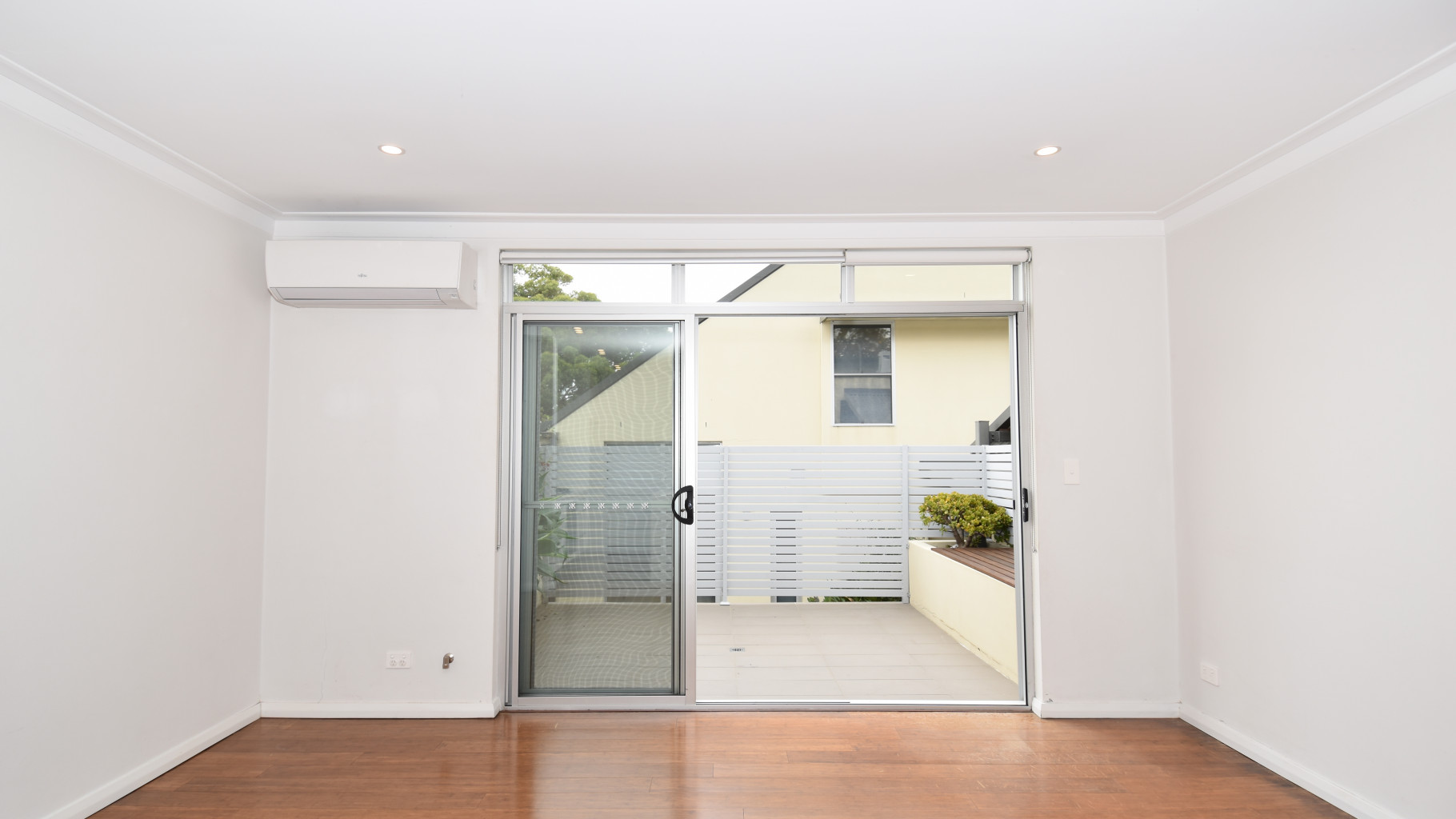 - Open plan living and dining room features timber floors, gas outlet and split air conditioner that flows effortlessly to balcony