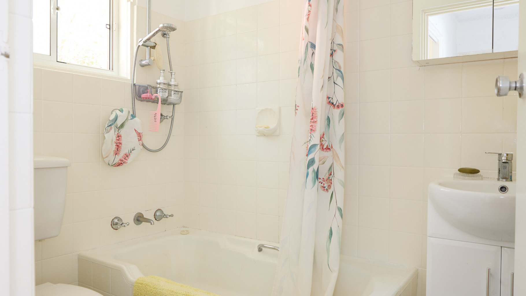 • Neat bathroom with shower over bath