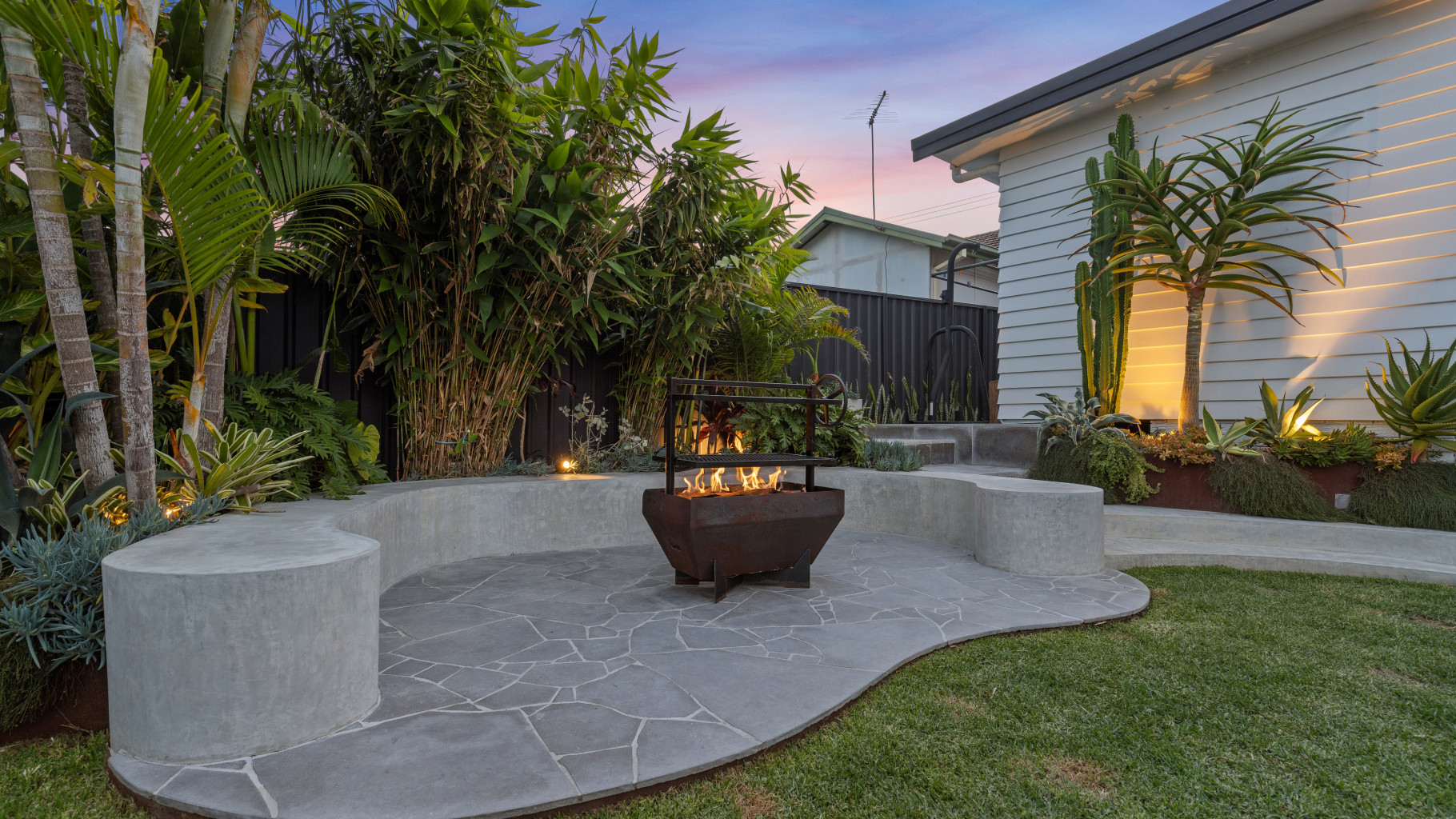 - Handcrafted burnished concrete firepit area designed for year-round use, overlooking the outdoor space