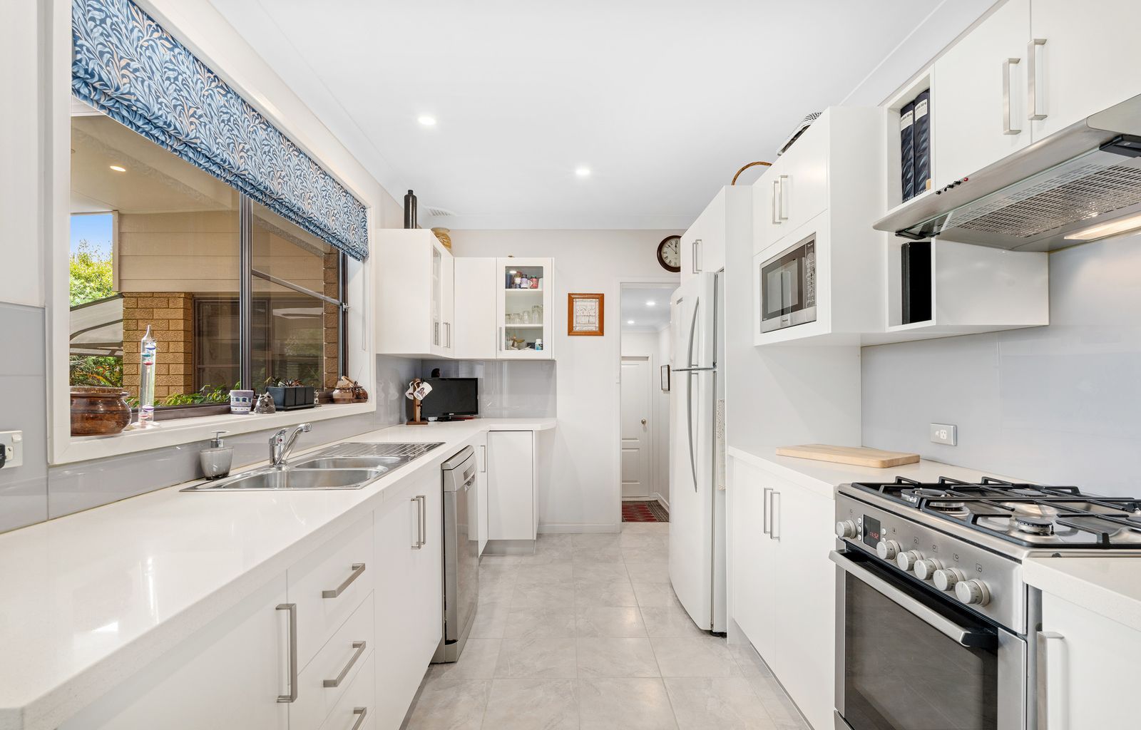 - Kitchen offers stone benchtops, double sink, Bosch gas cooktop, electric oven and dishwasher, abundant storage and a large window overlooking the undercover deck and backyard. An adjoining eat-in area provides a cosy everyday dining space.
