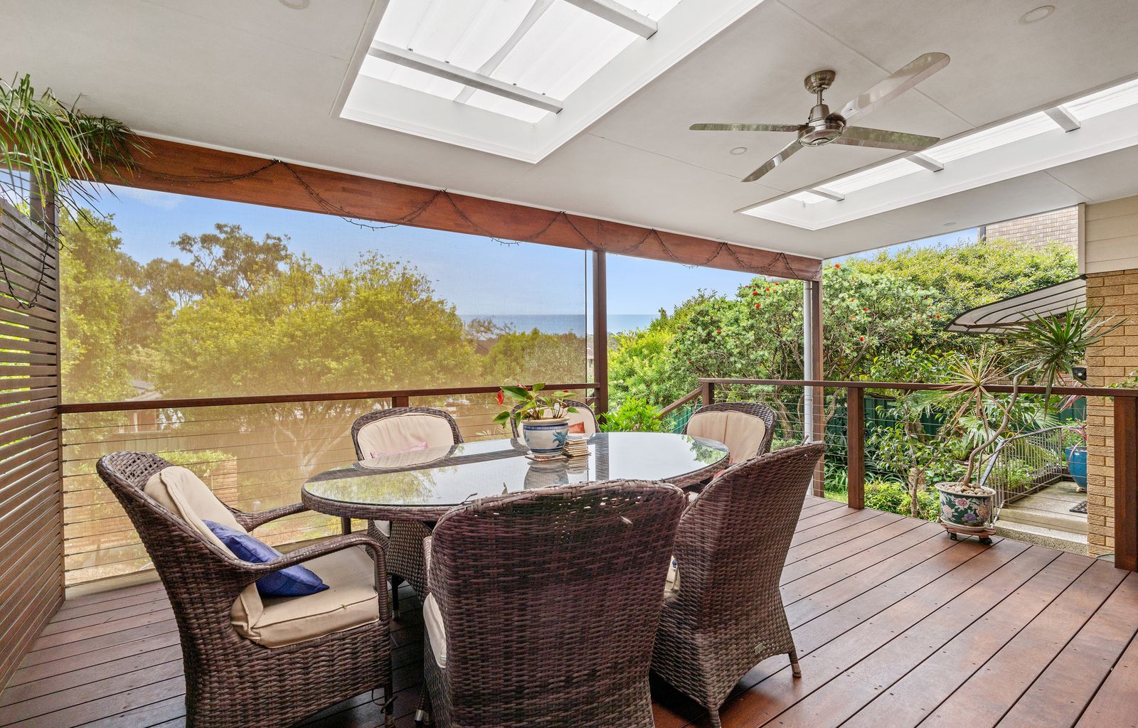 - A private, covered deck with ceiling fan offers the ideal spot for entertaining year-round, overlooking the well-maintained backyard and established gardens.