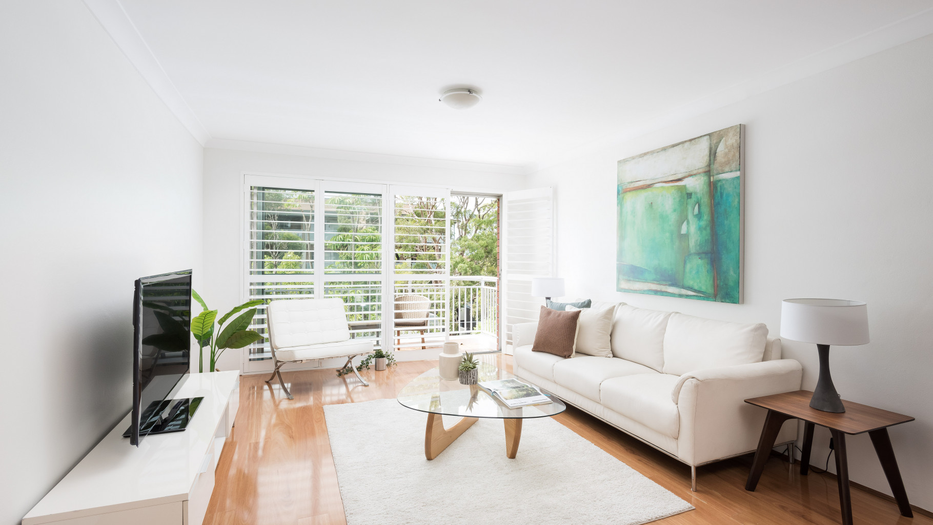 - Inviting open plan living and dining room bathed in natural light offers a peaceful leafy outlook, timber floors, plantation shutters and opens out onto balcony