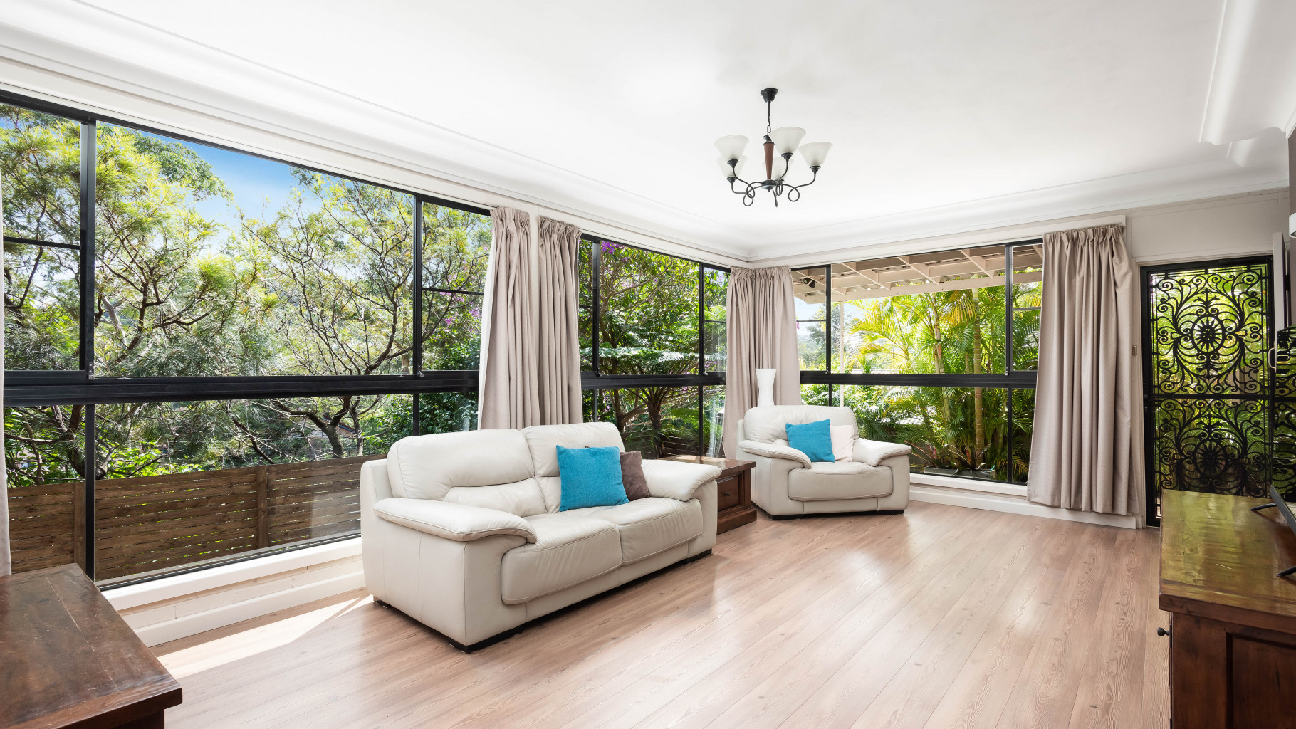 - Air-conditioned family lounge room featuring floating timber floorboards with leafy green outlook.