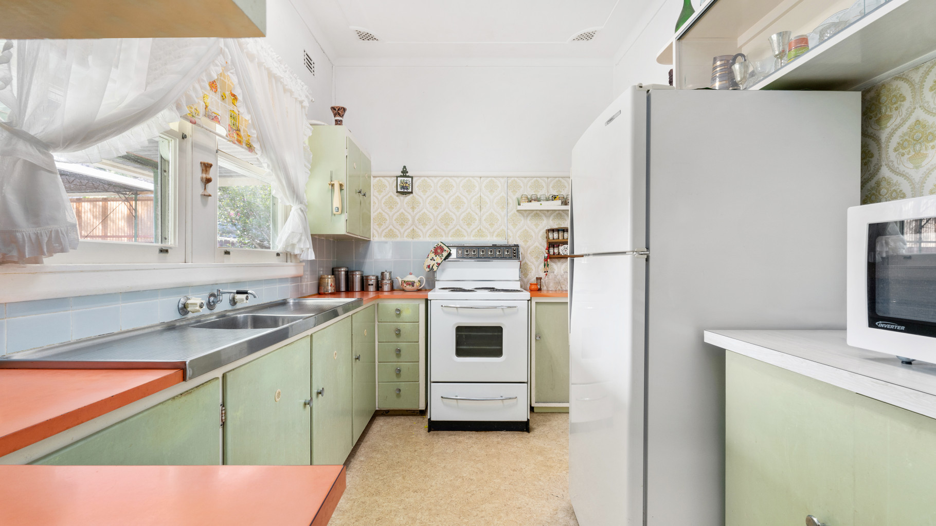 - Original kitchen complete with stove and oven, providing ample storage and bench space.