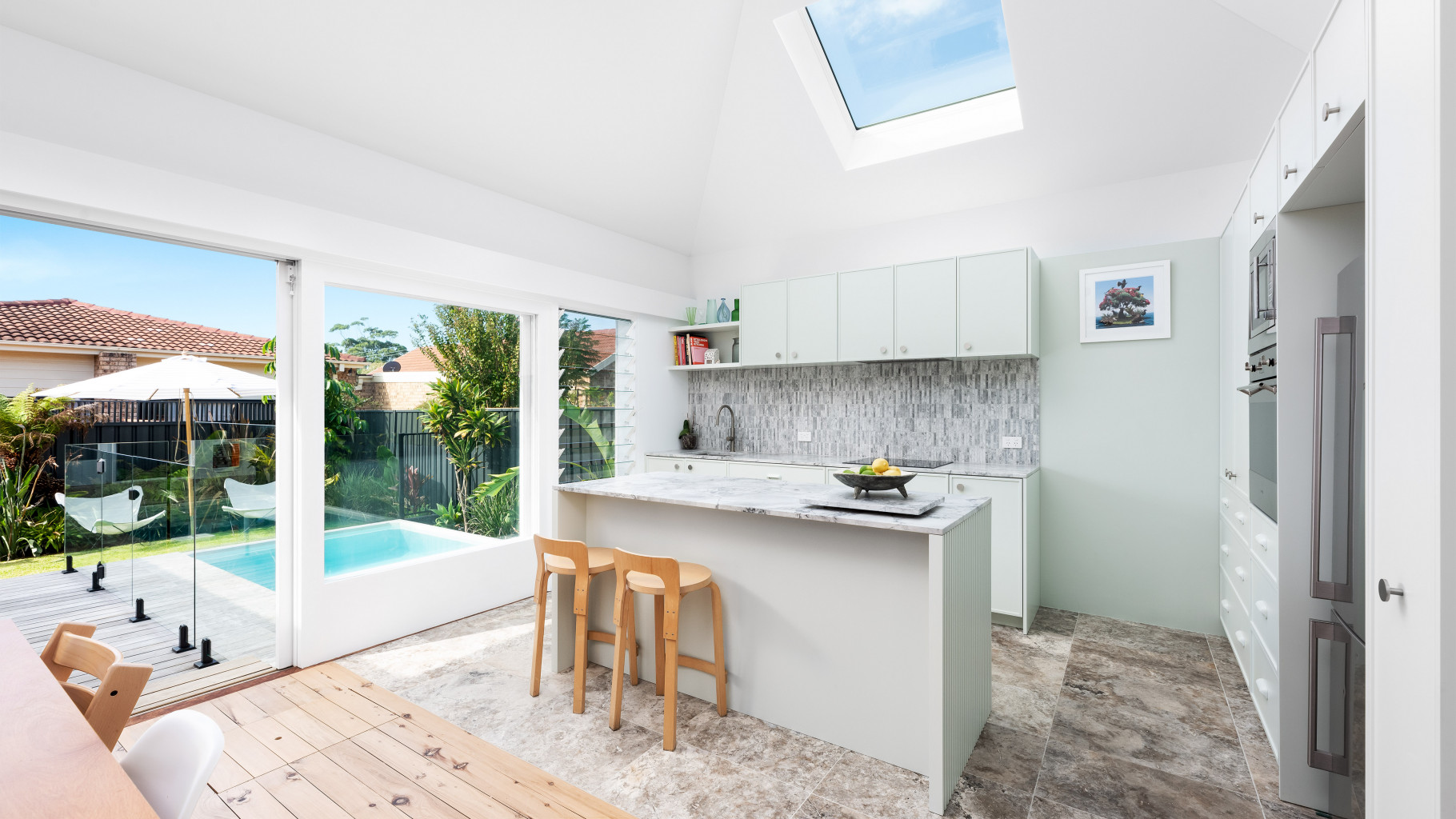 - Light filled kitchen, enhanced by cathedral ceilings and skylight, features quality Smeg appliances, beautiful dolomite marble slab benchtops and marble stacked mosaic splashback, custom made cabinetry with original door knobs, utilities nook and large island bench with breakfast bar.