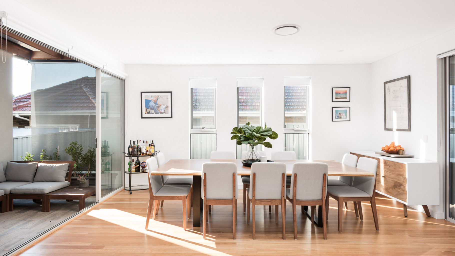 • Sun-filled and open plan living and dining room displaying ducted air conditioning, downlights and offers easy access to the outdoors