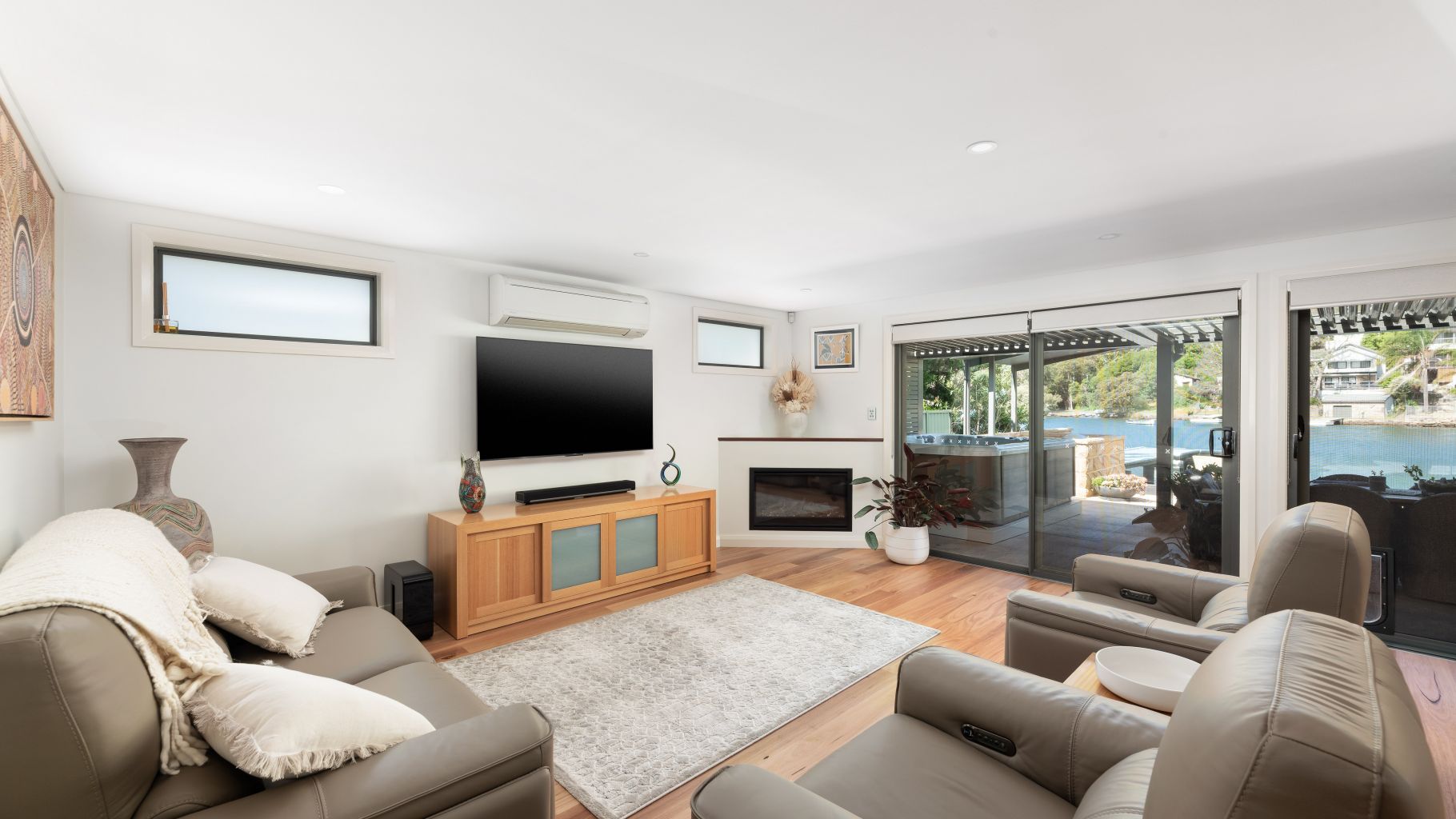 - A cosy family room provides an ideal space for unwinding, showcasing panoramic river views that enhance the tranquil atmosphere.