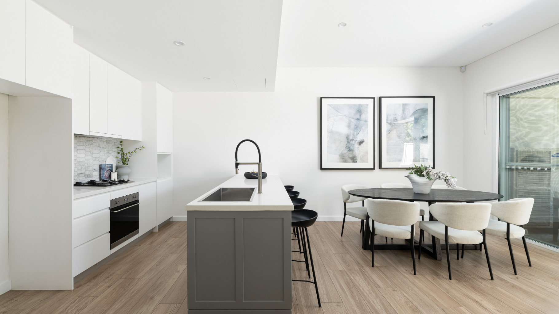 - Contemporary designer kitchen featuring sleek double width Caesarstone benchtops, soft close cabinetry, premium Smeg gas appliances, an integrated dishwasher and an island with breakfast bar seating.