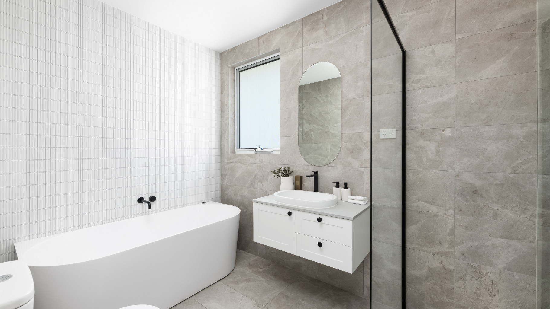 - Sleek family bathroom showcasing black fittings and fixtures, floor to ceiling tiling, floating vanity with ample storage, deep freestanding bathtub and a separate shower.