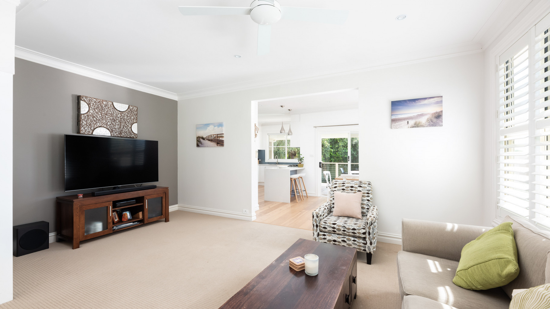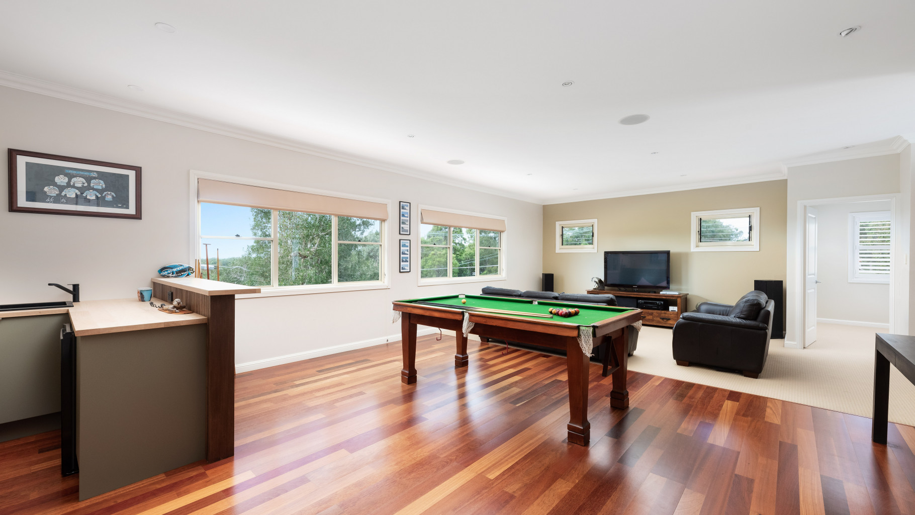 - Generous upstairs living area with distant views of Botany Bay and 2.7m high ceilings features wet bar, surround sound system and quality slate pool table.