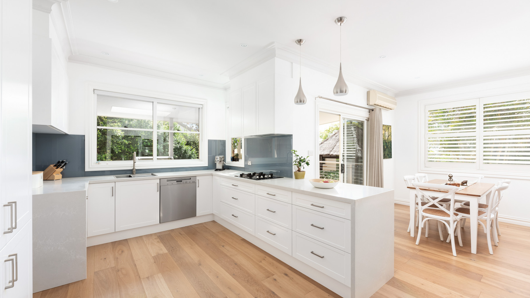 - Modern kitchen featuring 40mm caesarstone benchtop with breakfast bar seating, and equipped with high quality Ilve natural gas appliances, an abundance of sleek cabinetry, glass splash back and Miele dishwasher.